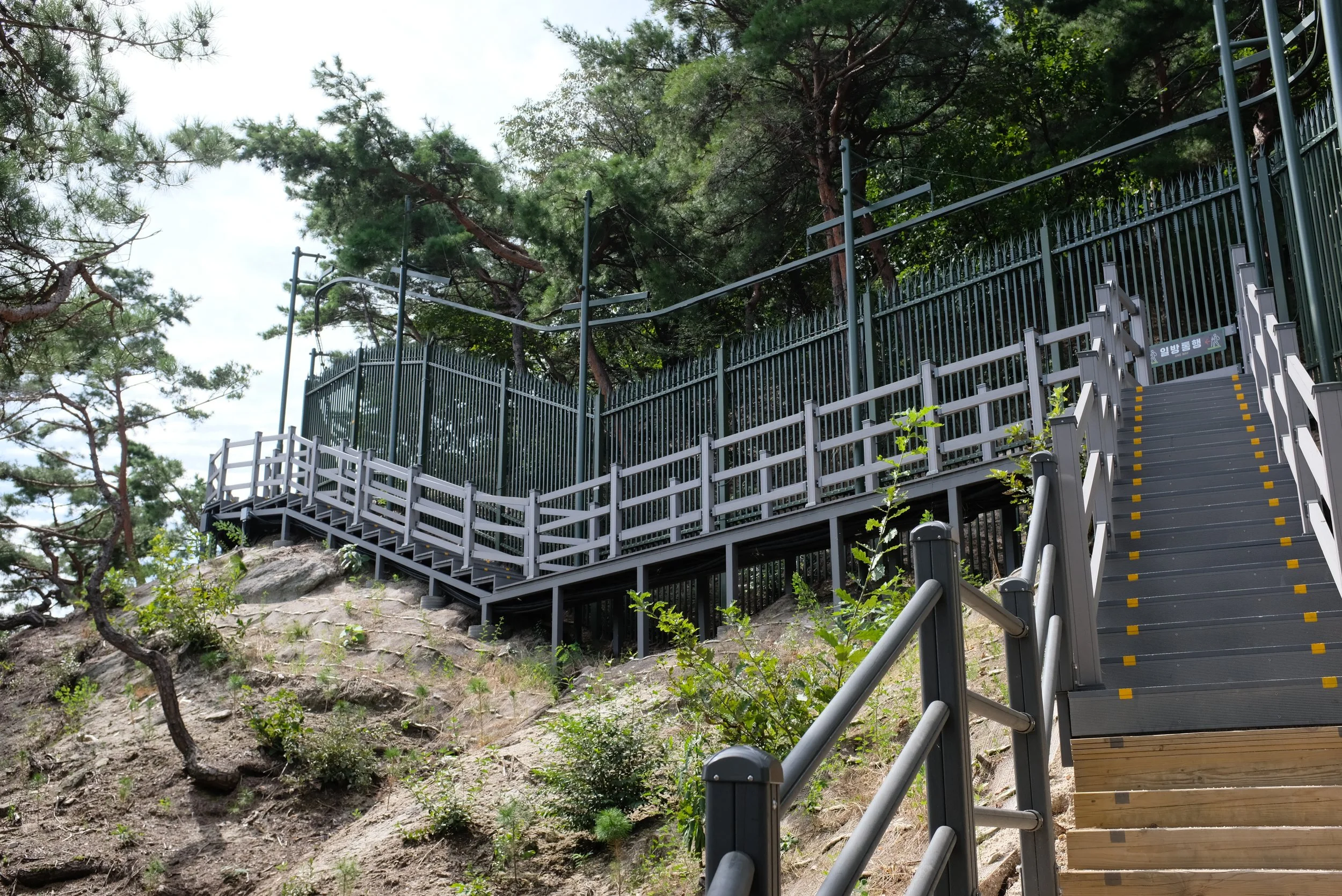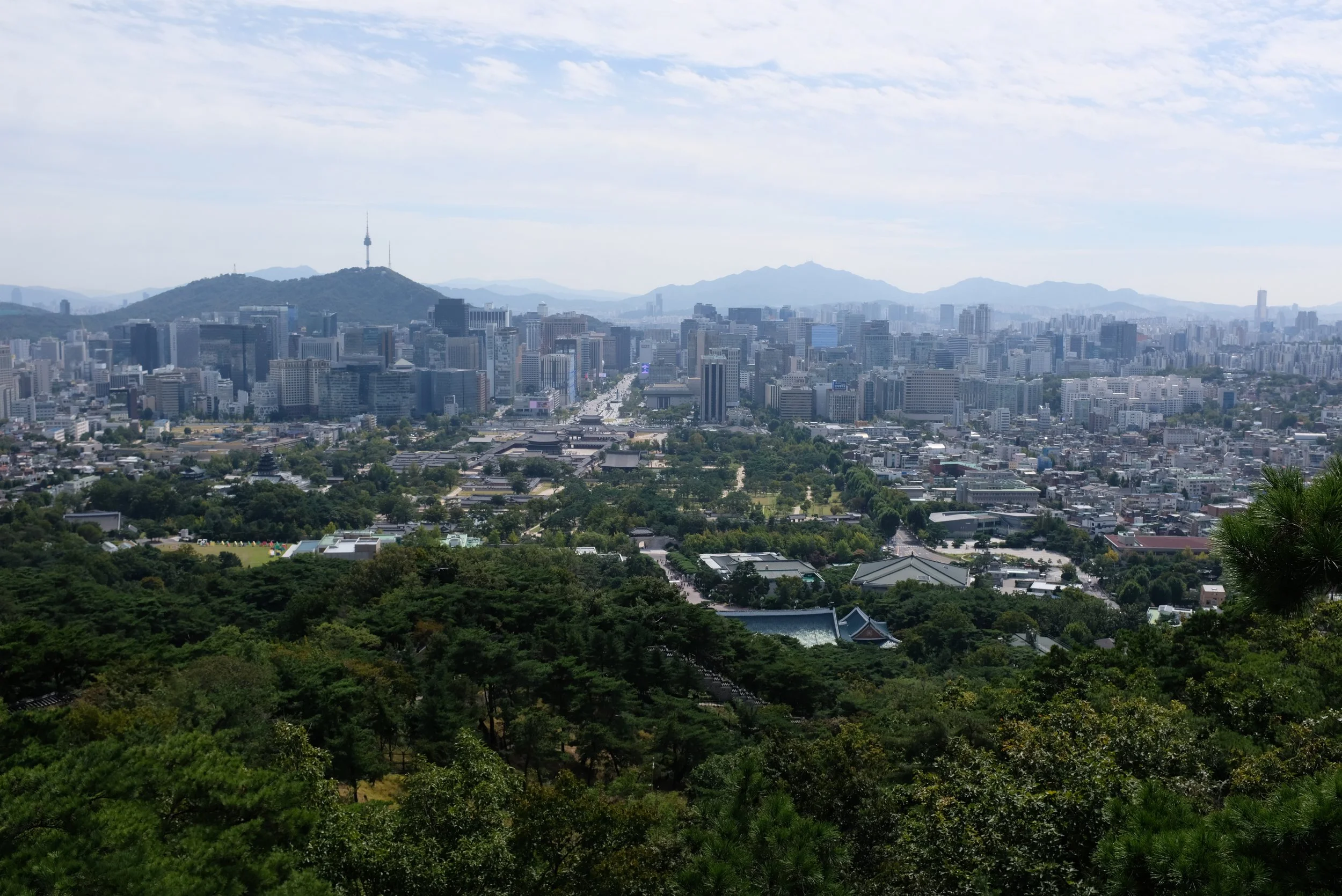 Just a short bus drive away from the Blue House is 북악산 (Bugaksan) | Naver link. What’s pretty cool about this mountain is that sections of the trails only opened up recently due to how close they are to the Blue House’s proximity. One section of the trails was opened by former president 문재인 (Moon Jae-in), and then another section by President Yoon after he relocated the presidential offices. I had read that a good place to start hiking the trails was 창의문 (Changuimun Gate) | Naver link. The trail does start as several flights of stone stairs along the old fortress wall. It’s mostly incline, so of course I struggled on my way to the top. I did meet an older gentleman who became my companion to the mountain’s summit, and every now and then he would speak poetically and use flowery language to describe our surroundings and his way of life. After reaching the peak together, we continued our trek, passing by 1.21 사태 소나무 (January 21 Incident Pine Tree): a tree which had bullets embedded in it from a firefight between North Korean infiltrators and South Korean forces in 1968. We parted ways shortly after, as I wanted to start making way down the recently opened trails and he wanted to reach a further point along the fortress wall. While there wasn’t really anything impressive about these trails, they did give me several great viewpoints of the Seoul cityscape, including the Blue House grounds which I had explored earlier.