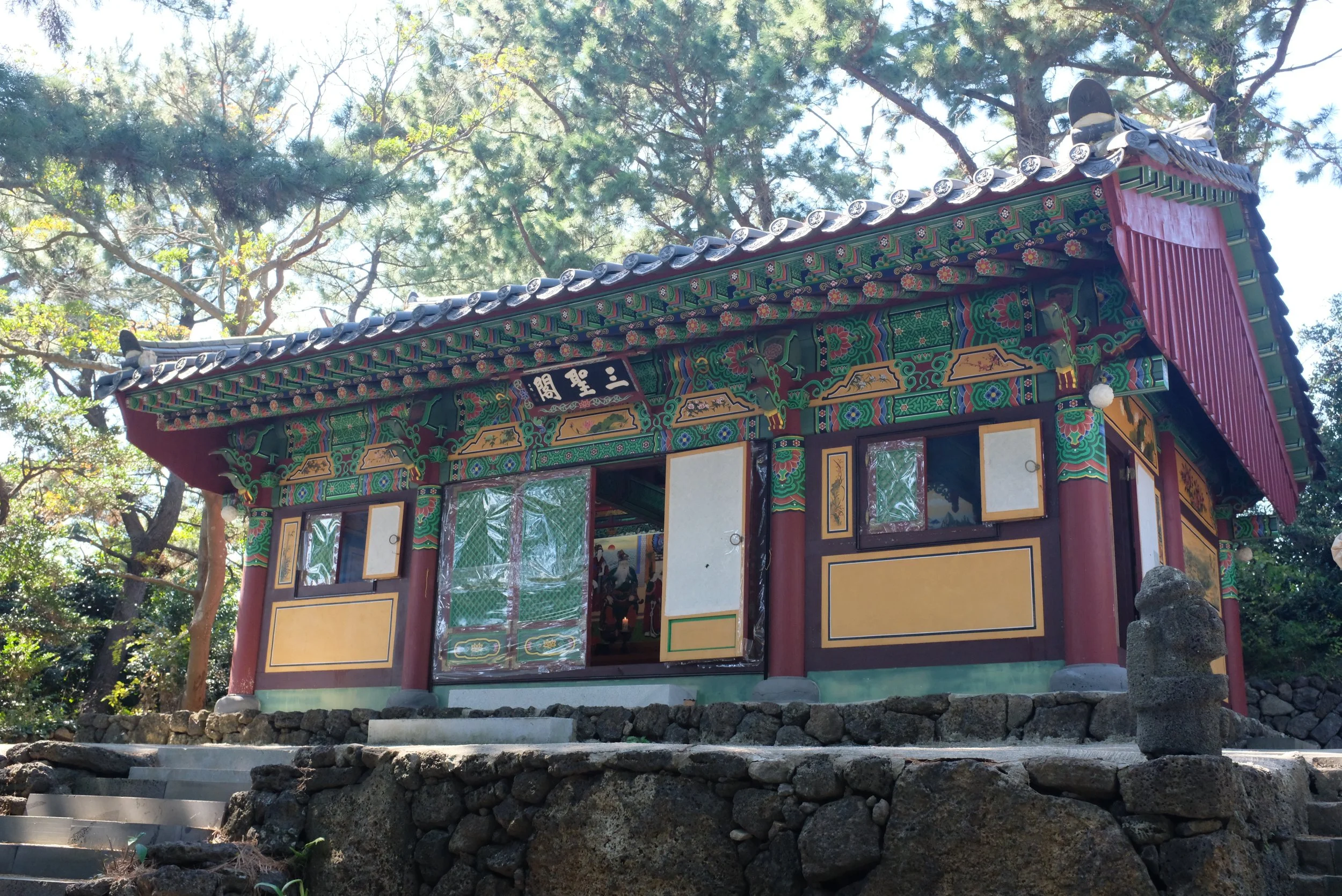 While 약천사 (Yakcheonsa) | Naver link isn’t the most impressive Buddhist temple I visited during my Korea trip, it’s certainly up there. When I went, there were only a handful of visitors, and parking was plentiful. There also wasn’t a charge for admission. There’s a path, flanked by hareubang statues on both sides, leading up to a flight of stairs, which then rise up toward the main temple itself. Though the temple’s origins are unknown, I could see that it has been well maintained. I’m not Buddhist, so I don’t experience anything spiritual when I visit, but I can’t help but be impressed by these temples for their architectural designs and artworks. One of the temple’s features that I greatly admired were the window shutters, as they displayed carvings of Buddhist folklore and floral patterns.