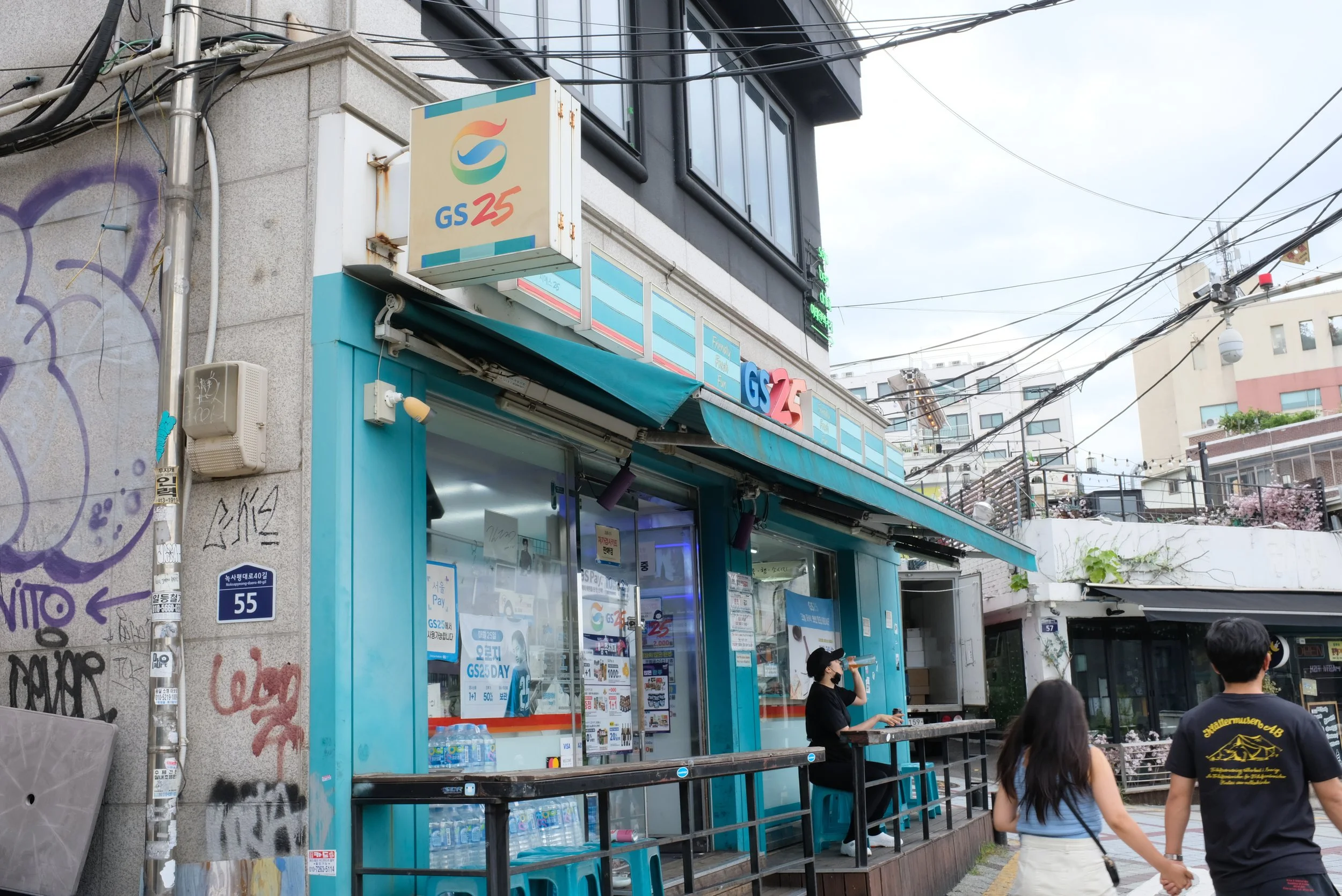 I had been planning to walk back to my Airbnb, but by the mid-afternoon, my legs felt like putty, and I decided that I was better off taking the bus or a subway - this meant I should get a T-Money Card, which is used for payment for taxis, buses, and the subway. I also remembered that rain was coming over the next few days, and I needed an umbrella. I asked one of the servers at Manimal Smoke House where I could acquite these items, and he directed me to a convenience store just down the road. Minutes later, I stepped into GS25 이태원힐점 (GS25 Itaewonhil Branch) | Naver link. I needed a drink as well as masks (the one I was wearing was just drenched in sweat), so I bought these as well as the umbrella to the counter. I asked for a T-Money Card, and then I had to load the card with cash, so I coughed up ₩10,000 (approximately $7.34) for that. In all, these items cost me about $16.96.