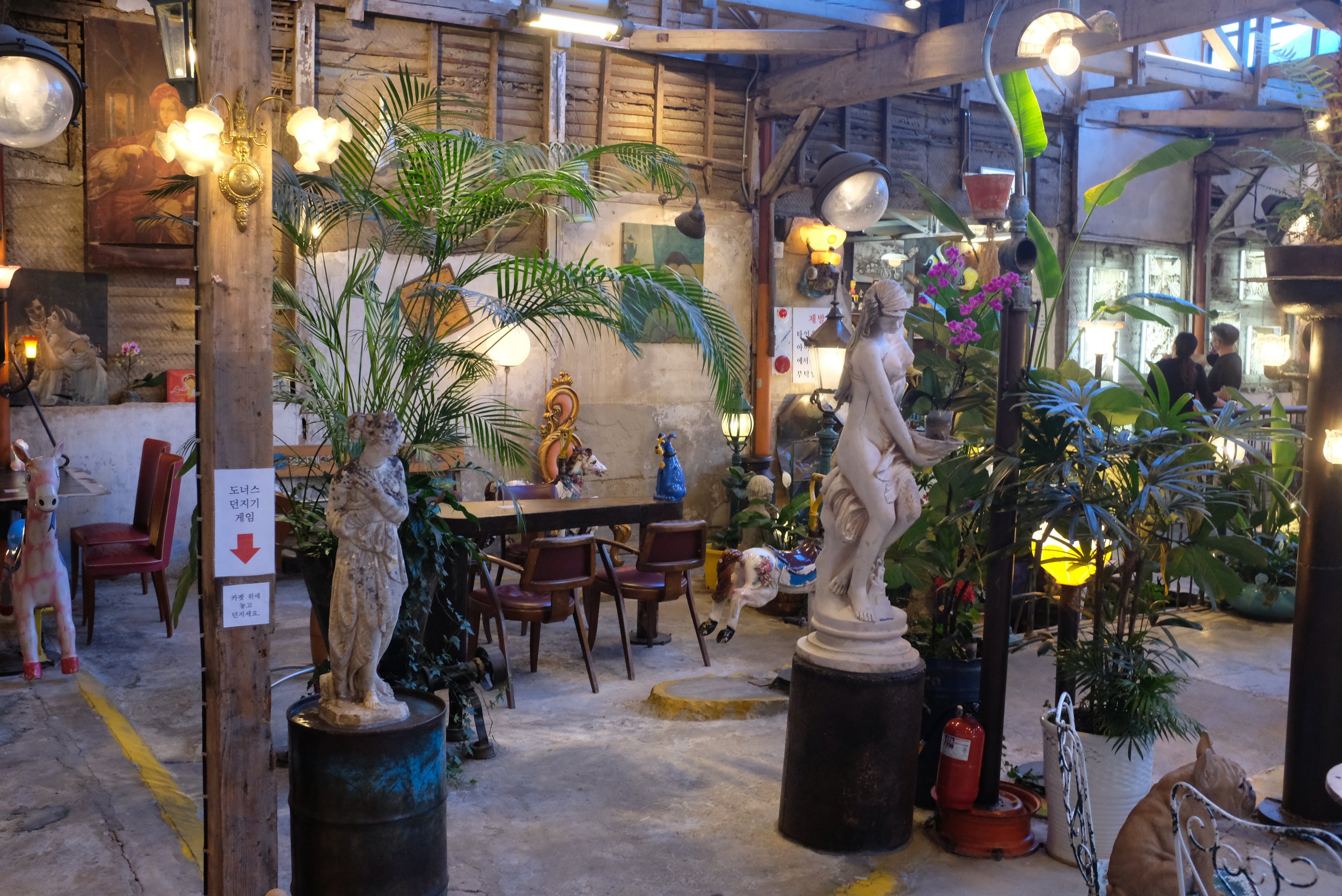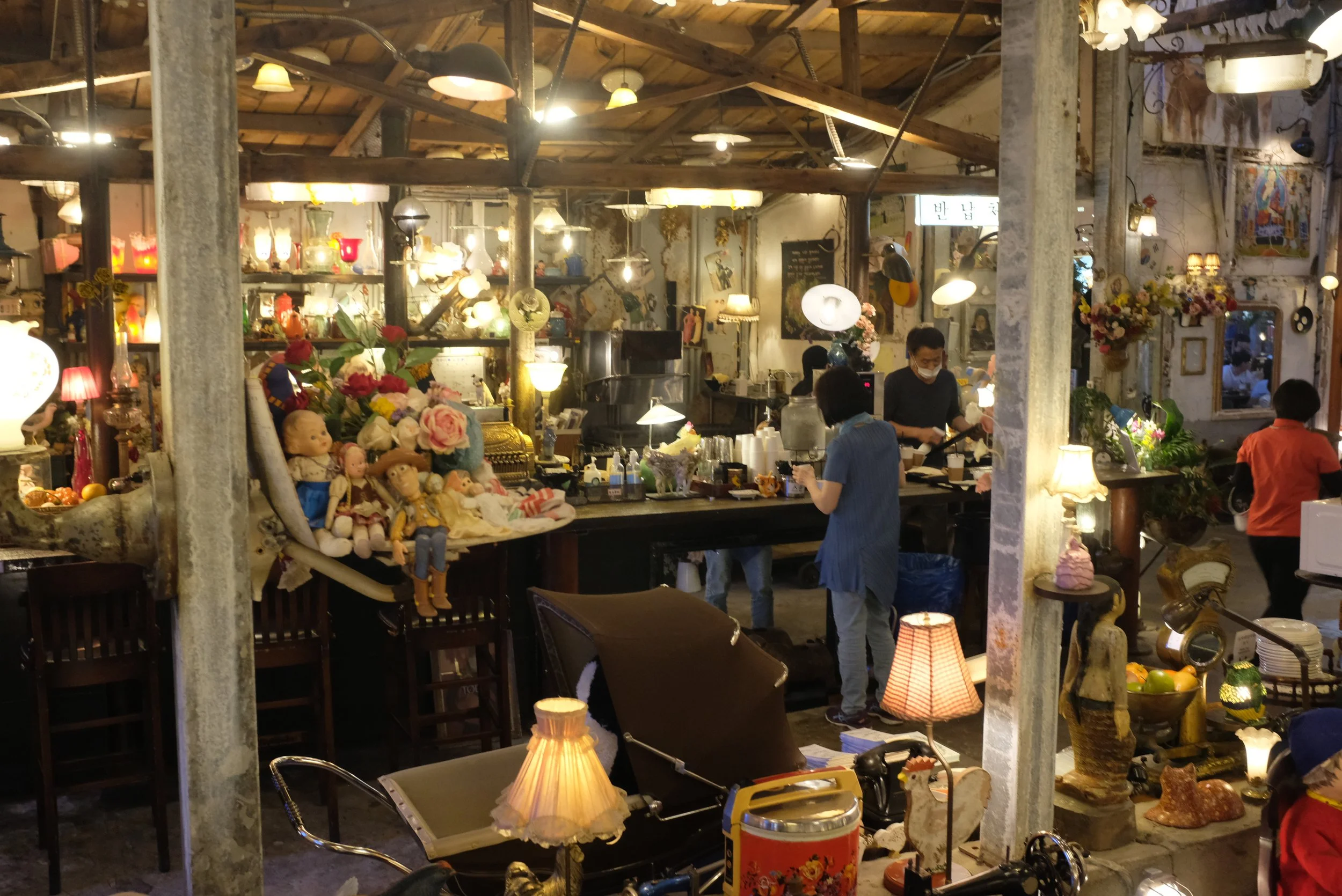 After lunch, it was prime time for a cafe visit, so we headed over to 조양방직 (Choyang Textile) | Naver link, which remains the most interesting cafe experience I had during my Korea trip. Yes, there’s a bakery (we didn’t get anything from there) as well as a drink-making station, but this former textile factory-turned cafe is really more a museum, containing hundreds, if not thousands, of various household artifacts from as early as the ‘60s. Tables and chairs are spread out across what was the factory floor, and they are lit by a variety of lamps. I got myself a 생자두복숭아아이스티 (fresh plum peach iced tea), which cost ₩8,000 (estimated $5.59), and I sipped on this refreshing, sweet drink as I walked from room to room, all of which have so much going on that my eyes always had something to look at, from telephones and child-sized toy cars to movie posters and carousel ride horses. There are actually multiple buildings here that serve as an extension of this cafe/museum, and they’re very much worth exploring if you’d like to get an idea of what life was like several decades ago.
